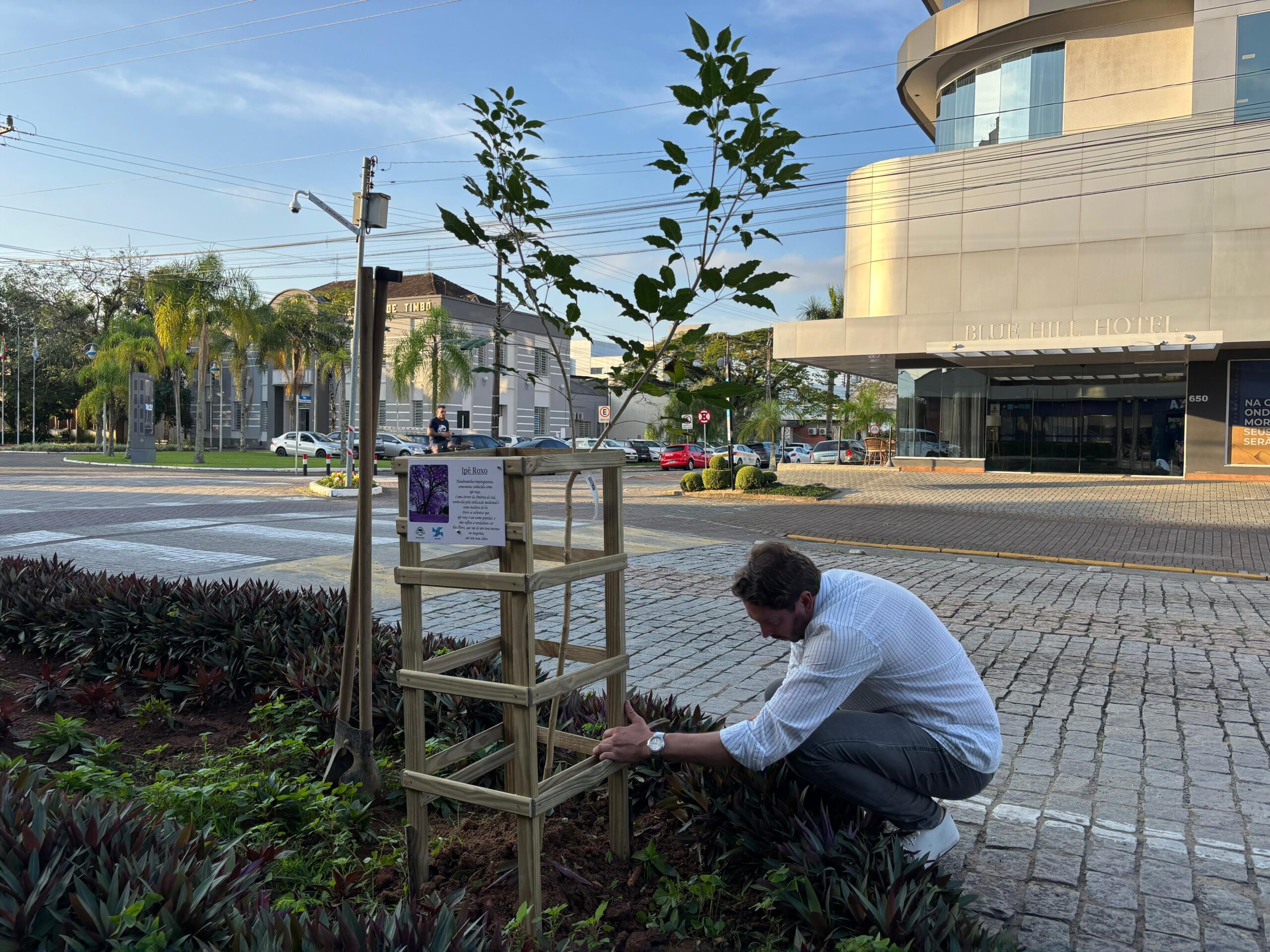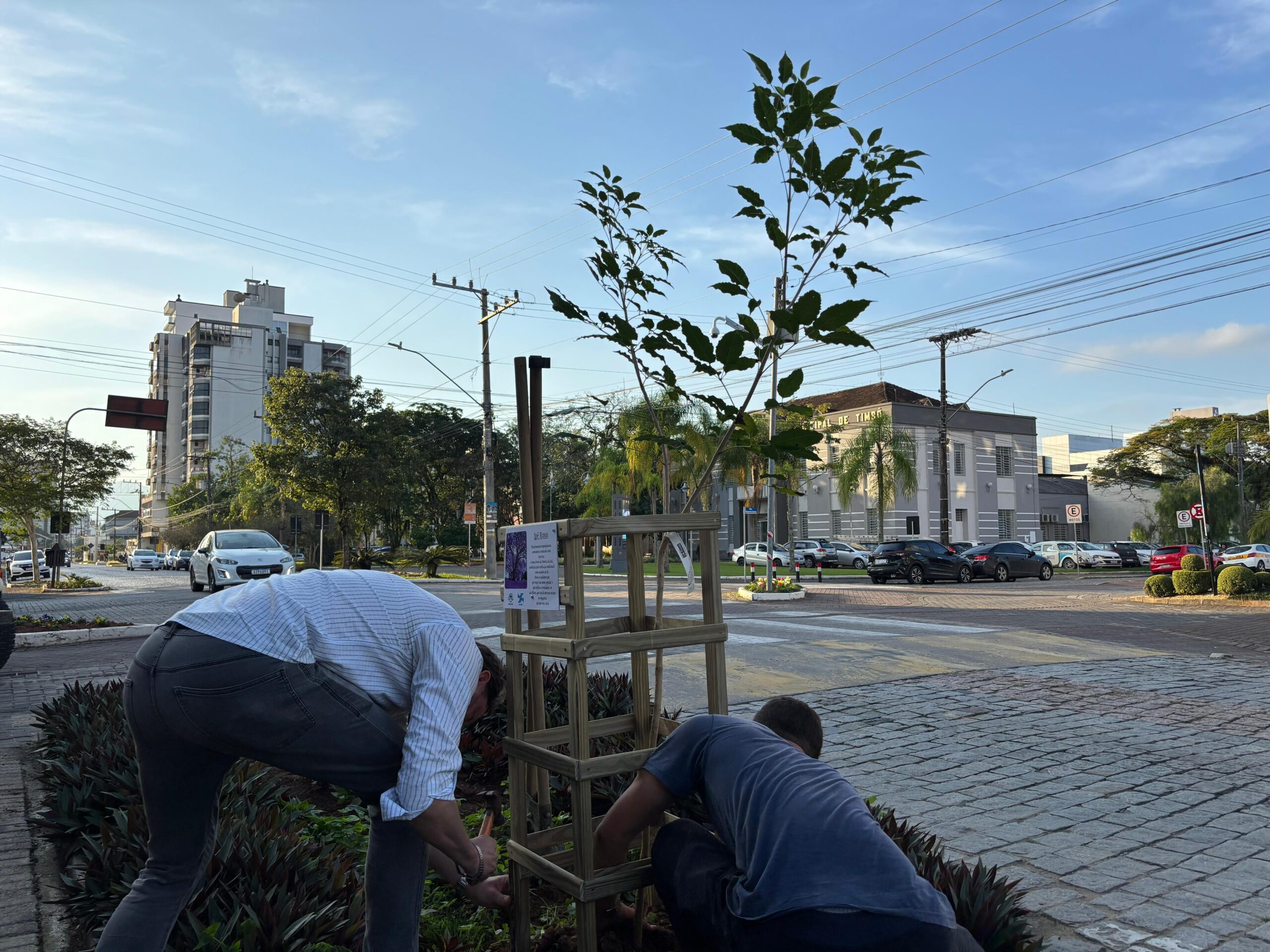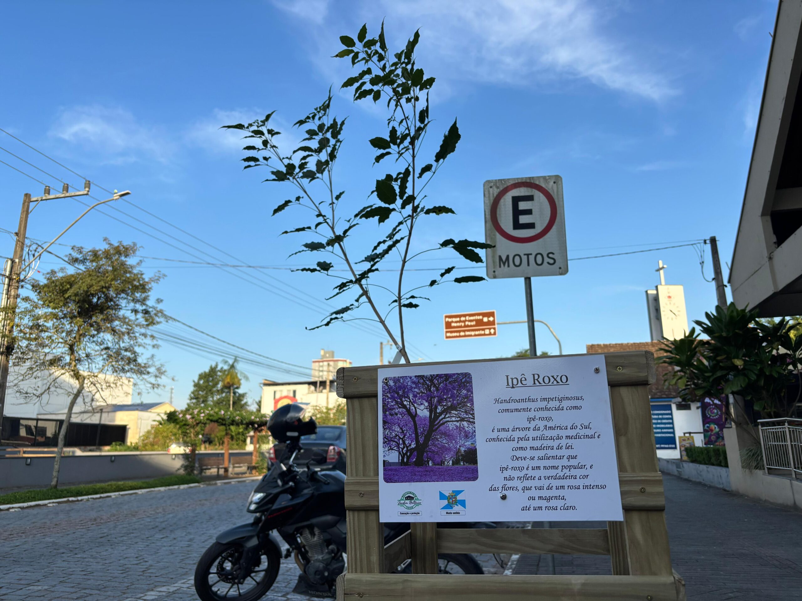 Uma muda de ipê roxo foi plantada na manhã de terça-feira, 27, na Avenida Getúlio Vargas, em Timbó, no mesmo local onde uma árvore havia sido derrubada por um temporal em fevereiro deste ano.
