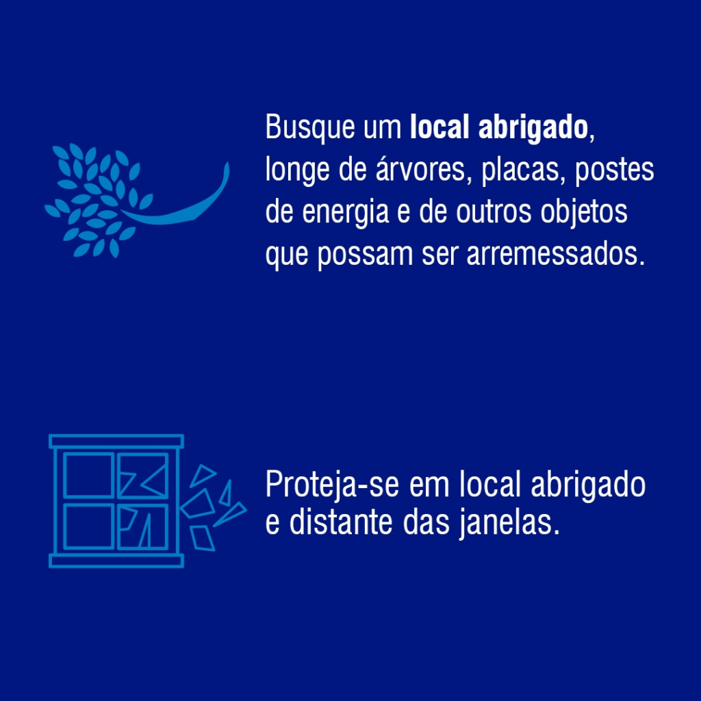 Com ventos fortes, não transite ou se abrigue próximo de árvores, muros, postes de energia e placas.