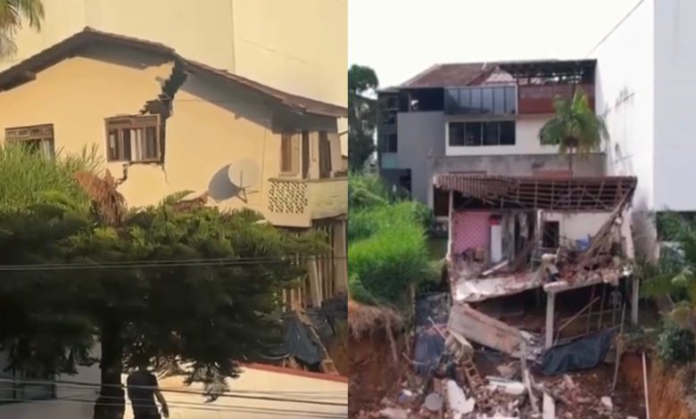 Registros feitos por vizinhos mostram o momento em que rachaduras se ampliam e partes do imóvel desmoronam. Apesar do impacto das imagens, ninguém ficou ferido.